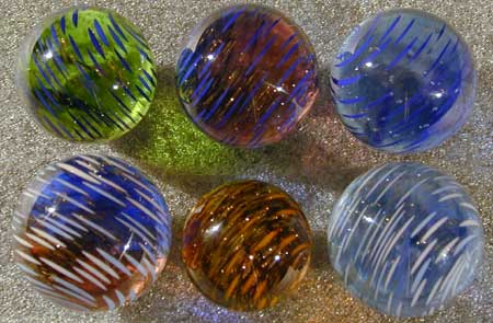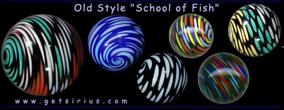 School of Fish  MarbleSchool of Fish marbles have two looks, the old style and the new. The old style was made of solid colors, usually on a black base. The new style are made on a clear-colored base. Some will have aventurine highlights below the surface of the marble as you can just make out in the following photo of 6 "School of Fish".
