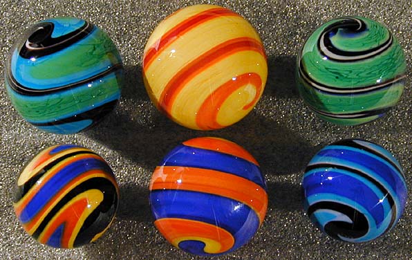 Goofball is the name given to these simple swirl marbles. Most of my Goofballs will have a black base but a few have other color base glass. All Goofballs are opaque glass. A few are coated with clear glass, most are not.